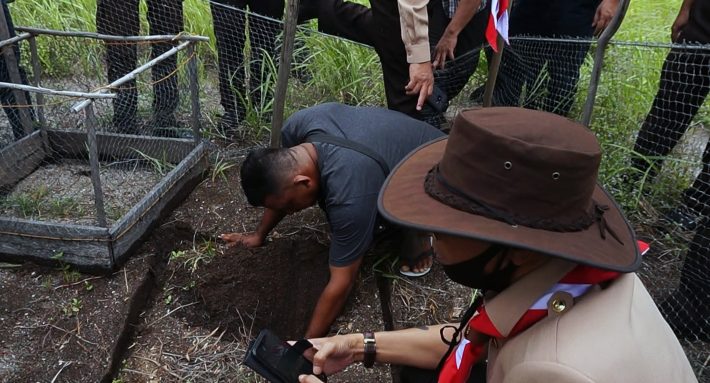 “Kalau kaki belakangnya sudah lurus begini (ke belakang menutupi lubang), itu pasti mulai bertelur. Kalau sudah bertelur tidak apa-apa kita dekat, tapi jangan dekat sangat. Matanya jangan disenter, dia silau,” kata Bujang.